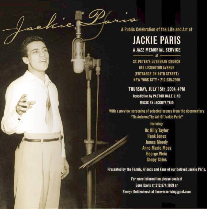 In MemoriamOn June 17th, 2004, Jazz lost one of it's greatest talents. Our condolences go out to all of Jackie's family, friends, and the people whose lives he has touched with his music for over sixty years.A memorial was held at St. Peter's on Thursday, July 15th.In keeping with the tradtion of the "Jazz Church", the event was a combination of service, reminisence and performances by perfomers both obscure and legendary, honoring one of the greatest singers Jazz has known. |